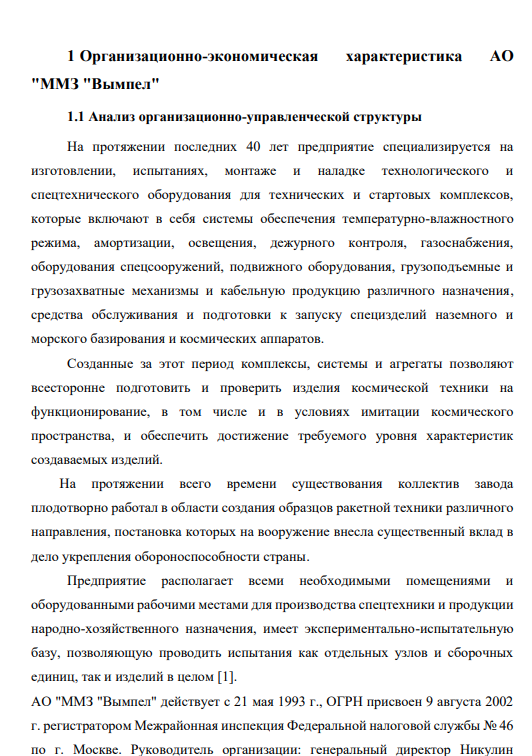 Часть 1. Организационно-управленческая. Выполнить анализ организационноуправленческой структуры, видов экономической деятельности и видов выпускаемой продукции АО "ММЗ "Вымпел".