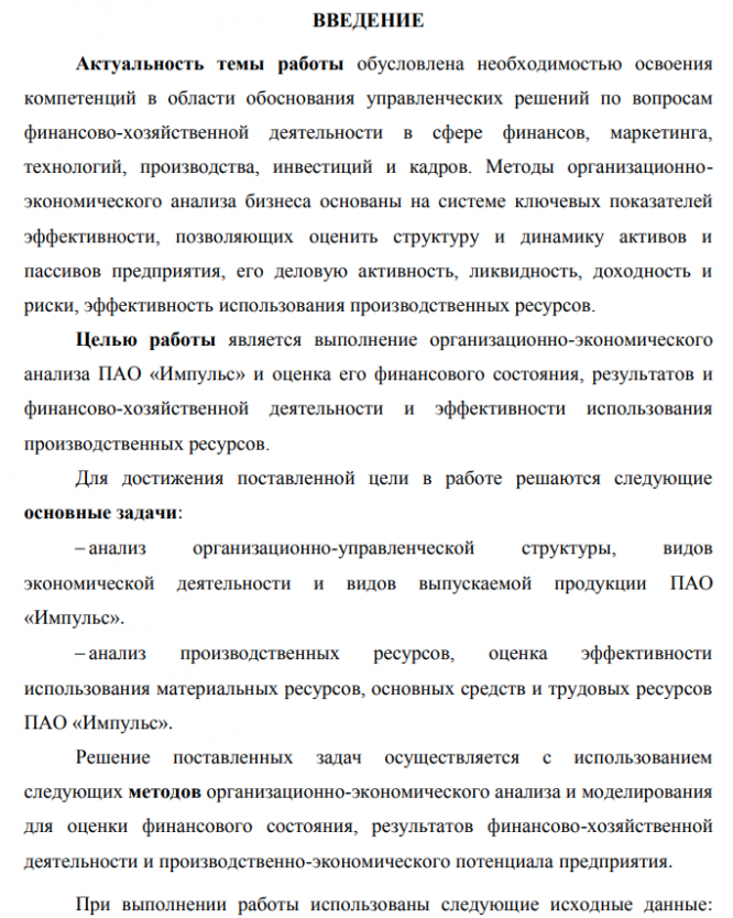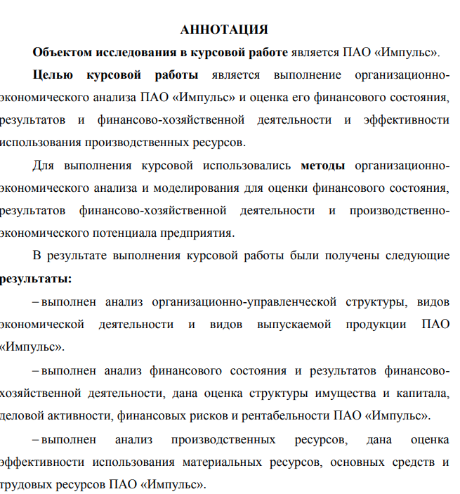 Объектом исследования в курсовой работе является ПАО «Импульс». Целью курсовой работы является выполнение организационноэкономического анализа ПАО «Импульс» и оценка его финансового состояния, результатов и финансово-хозяйственной деятельности и эффективности использования производственных ресурсов. Для выполнения курсовой использовались методы организационноэкономического анализа и моделирования для оценки финансового состояния, результатов финансово-хозяйственной деятельности и производственноэкономического потенциала предприятия
