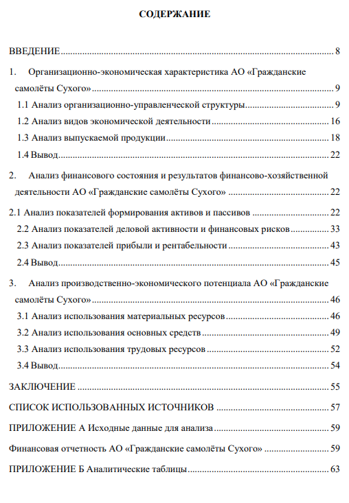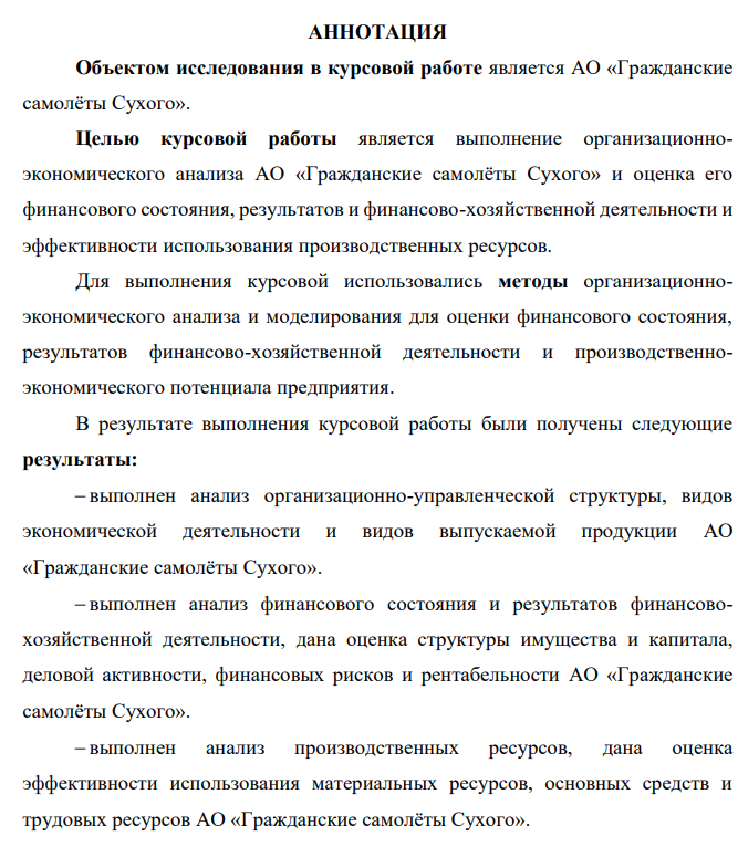 Целью курсовой работы является выполнение организационноэкономического анализа АО «Гражданские самолёты Сухого» и оценка его финансового состояния, результатов и финансово-хозяйственной деятельности и эффективности использования производственных ресурсов.