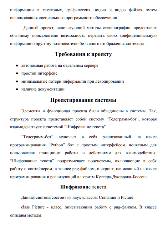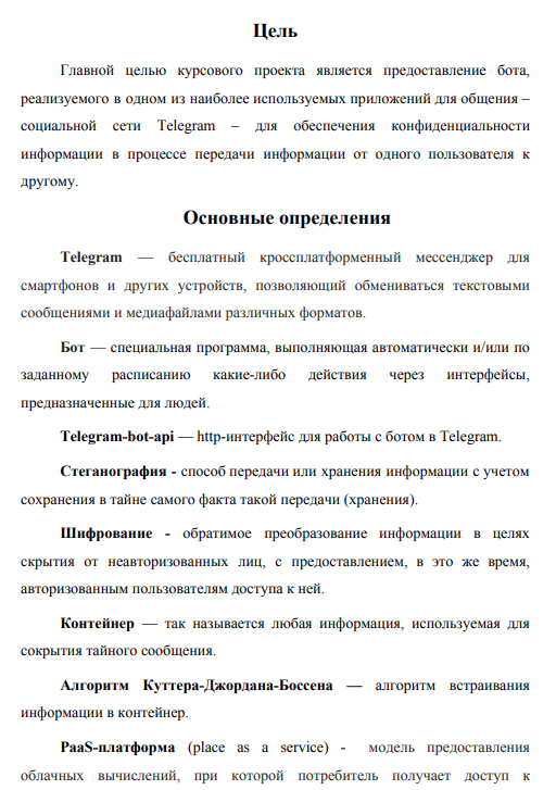 Главной целью курсового проекта является предоставление бота, реализуемого в одном из наиболее используемых приложений для общения – социальной сети Telegram – для обеспечения конфиденциальности информации в процессе передачи информации от одного пользователя к другому.