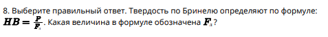8. Выберите правильный ответ. Твердость по Бринелю определяют по формуле: . Какая величина в формуле обозначена ?