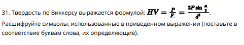 31. Твердость по Виккерсу выражается формулой: . Расшифруйте символы, использованные в приведенном выражении (поставьте в соответствие буквам слова, их определяющие).