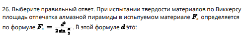 26. Выберите правильный ответ. При испытании твердости материалов по Виккерсу площадь отпечатка алмазной пирамиды в испытуемом материале определяется по формуле . В этой формуле это: