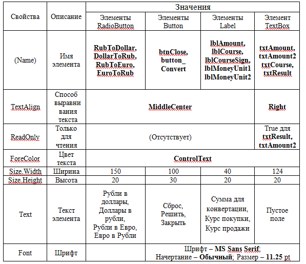 Программа должна правильно обрабатывать операции с действительными (вещественными) числами. При изменении направления конвертации должны «очищаться» поля результатов работы, отображаться соответствующий курс обмена, а единицы измерения должны меняться. Введенный курс обмена в каждом направлении должен запоминаться и появляться при очередном выборе данного направления обмена. Полученный результат конвертирования валюты необходимо округлять строго до сотых