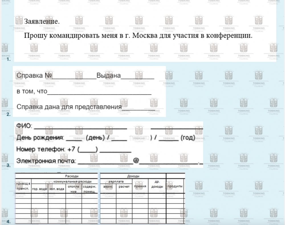 Перед вами различные виды документации. Выберите все документы, которые относятся к унифицированным формам документации и перечислите их цифрами, через запятую, без пробелов.