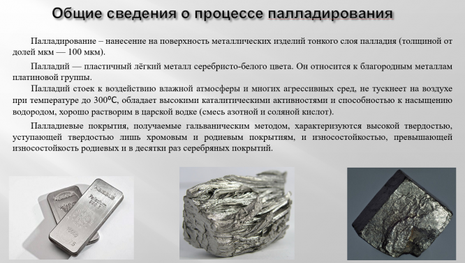 Палладирование – нанесение на поверхность металлических изделий тонкого слоя палладия (толщиной от долей мкм — 100 мкм).