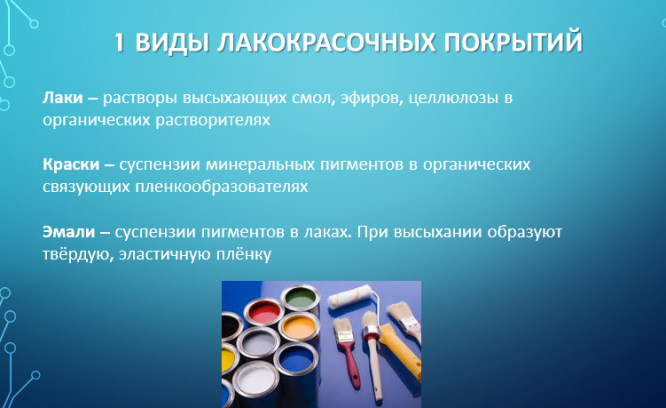 Выполняя функции защиты металлов, дерева и других материалов лакокрасочные покрытия также являются общепринятым средством декоративной и цветовой отделки изделий промышленности.
