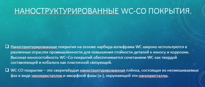 Наноструктурированные покрытия на основе карбида вольфрама WC широко используются в различных отраслях промышленности для повышения стойкости деталей к износу и коррозии. Высокая износостойкость WC–Со-покрытий обеспечивается сочетанием WC как твердой составляющей и кобальта как пластичной связующей [1, стр. 1].