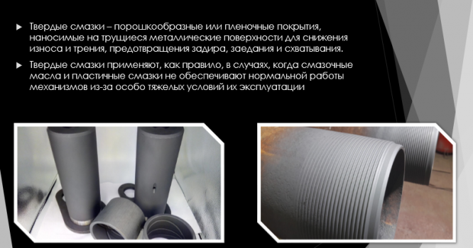 Твердые смазки – порошкообразные или пленочные покрытия, наносимые на трущиеся металлические поверхности для снижения износа и http://www.xumuk.ru/encyklopedia/2/4546.html" title="Химическая энциклопедия" rel="external noopener noreferrer">трения, предотвращения задира, заедания и схватывания. Они способны обеспечить улучшенное смазывание при более высоких температурах по сравнению с традиционными смазками на масляной основе.