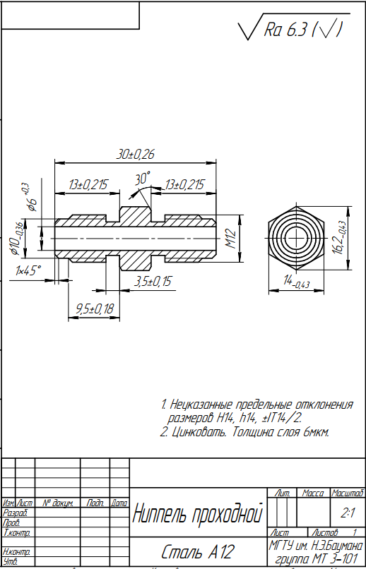 Для студентов МГТУ им. Н.Э.Баумана по предмету Технология и оборудование нанесения покрытий (МТ-3)Технология покрытия Ниппель проходнойТехнология покрытия Ниппель проходной