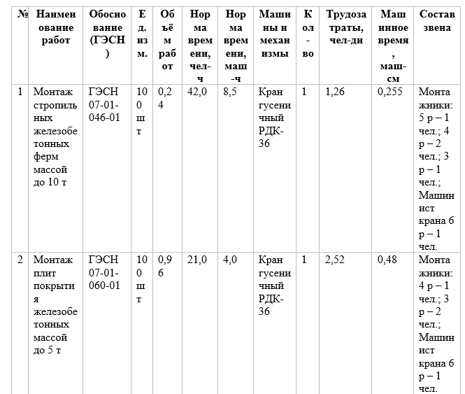 Исходные данные (из таблицы 4): - Монтаж стропильных железобетонных ферм массой до 10 т: объём работ 0,24 (100 шт), норма времени чел-ч = 42,0, норма времени маш-ч = 8,5, кран гусеничный РДК-36.