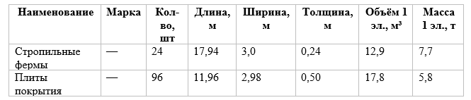 2. Элементы, входящие в объём работ (стропильные фермы и плиты покрытия) с их размерами и массой.