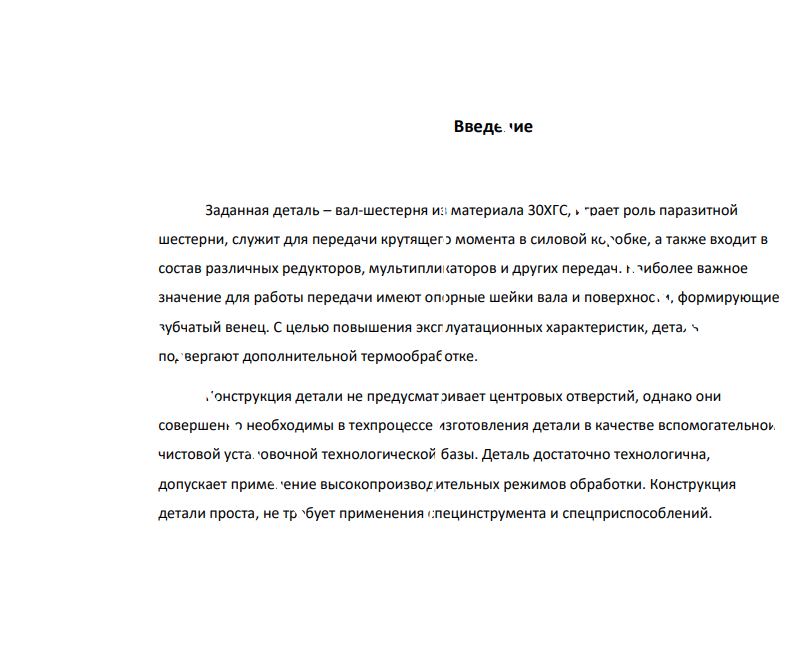 Заданная деталь – вал-шестерня из материала 30ХГС, играет роль паразитной шестерни, служит для передачи крутящего момента в силовой коробке, а также входит в состав различных редукторов, мультипликаторов и других передач. Наиболее важное значение для работы передачи имеют опорные шейки вала и поверхности, формирующие зубчатый венец. С целью повышения эксплуатационных характеристик, деталь подвергают дополнительной термообработке. Конструкция детали не предусматривает центровых отверстий, однако они совершенно необходимы в техпроцессе изготовления детали в качестве вспомогательной чистовой установочной технологической базы. Деталь достаточно технологична, допускает применение высокопроизводительных режимов обработки. Конструкция детали проста, не требует применения специнструмента и спецприспособлений.