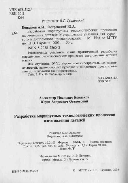 Для студентов МГТУ им. Н.Э.Баумана по предмету Технология конструкционных материалов (ТКМ)Кондаков А.И., Островский Ю.А. - Разработка маршрутных техпроцессов изготовления деталейКондаков А.И., Островский Ю.А. - Разработка маршрутных техпроцессов изготовления деталей