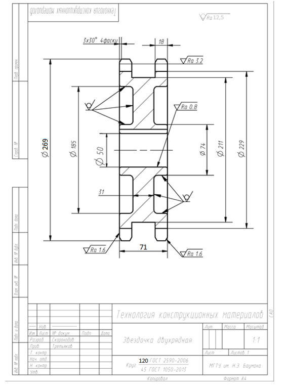 Для студентов МГТУ им. Н.Э.Баумана по предмету Технология конструкционных материалов (ТКМ)Проектирование и изготовление технологичной конструкции детали - Звездочка двухряднаяПроектирование и изготовление технологичной конструкции детали - Звездочка двухрядная