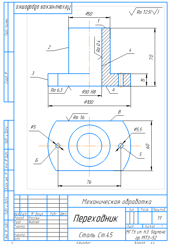 Для студентов МГТУ им. Н.Э.Баумана по предмету Технология конструкционных материалов (ТКМ)Механическая обработка заготовок деталей машин - ПереходникМеханическая обработка заготовок деталей машин - Переходник