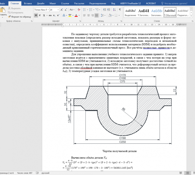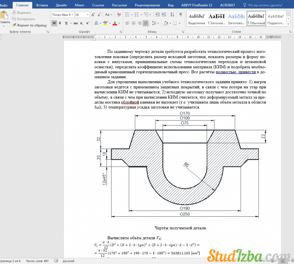 Для упрощения выполнения учебного технологического задания принято: 1) нагрев заготовки ведётся с применением защитных покрытий, в связи с чем потери на угар при вычислении КИМ не учитываются; 2) исходную заготовку получают достаточно точной по объёму, в связи с чем при вычислении КИМ считается, что деформируемый металл за пределы мостика облойной канавки не вытекает (т.е. учитываем лишь объём металла в области bоб); 3) температурная усадка заготовки не учитывается.