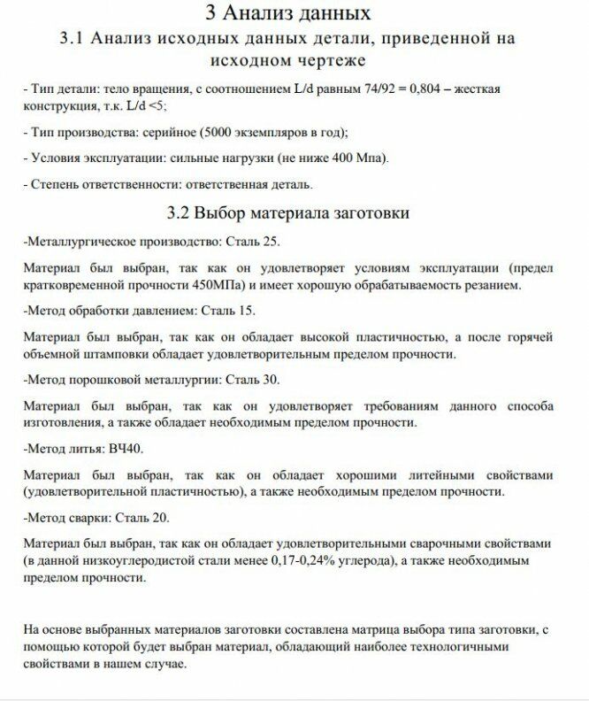 3.1 Анализ исходных данных детали, приведенной на исходном чертеже - Тип детали: тело вращения, с соотношением L/d равным 74/92 = 0,804 – жесткая конструкция, т.к. L/d <5; - Тип производства: серийное (5000 экземпляров в год); - Условия эксплуатации: сильные нагрузки (не ниже 400 Мпа). - Степень ответственности: ответственная деталь. 3.2 Выбор материала заготовки -Металлургическое производство: Сталь 25. Материал был выбран, так как он удовлетворяет условиям эксплуатации (предел кратковременной прочности 450МПа) и имеет хорошую обрабатываемость резанием. -Метод обработки давлением: Сталь 15. Материал был выбран, так как он обладает высокой пластичностью, а после горячей объемной штамповки обладает удовлетворительным пределом прочности. -Метод порошковой металлургии: Сталь 30. Материал был выбран, так как он удовлетворяет требованиям данного способа изготовления, а также обладает необходимым пределом прочности. -Метод литья: ВЧ40. Материал был выбран, так как он обладает хорошими литейными свойствами (удовлетворительной пластичностью), а также необходимым пределом прочности. -Метод сварки: Сталь 20. Материал был выбран, так как он обладает удовлетворительными сварочными свойствами (в данной низкоуглеродистой стали менее 0,17-0,24% углерода), а также необходимым пределом прочности. На основе выбранных материалов заготовки составлена матрица выбора типа заготовки, с помощью которой будет выбран материал, обладающий наиболее технологичными свойствами в нашем случае.