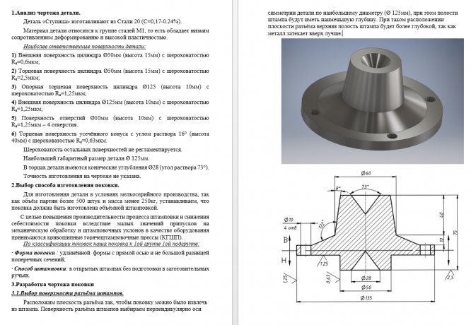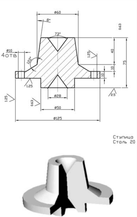 Деталь «Ступица » изготавливают из Стали 20 (С=0,17-0.24%). Материал детали относится к группе сталей М1, то есть обладает низким сопротивлением деформированию и высокой пластичностью. Наиболее ответственные поверхности детали: 1) Внешняя поверхность цилиндра Ø50мм (высота 15мм) с шероховатостью Ra=0,6мкм; 2) Торцевая поверхность цилиндра Ø50мм (высота 15мм) с шероховатостью Ra=2,5мкм; 3) Опорная торцевая поверхность цилиндра Ø125 (высота 10мм) с шероховатостью Ra=1,25мкм; 4) Внешняя поверхность цилиндра Ø125мм (высота 10мм) с шероховатостью Ra=1,25мкм; 5) Поверхность отверстий Ø10мм (высота 10мм) с шероховатостью Ra=1,25мкм – 4 отверстия. 6) Торцевая поверхность усечённого конуса с углом раствора 16° (высота 40мм) с шероховатостью Ra=0,63мкм.