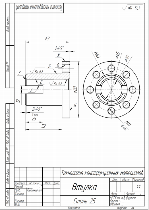Для студентов МГТУ им. Н.Э.Баумана по предмету Технология конструкционных материалов (ТКМ)Механическая обработка заготовок деталей машин - ВтулкаМеханическая обработка заготовок деталей машин - Втулка