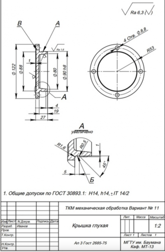 Для студентов МГТУ им. Н.Э.Баумана по предмету Технология конструкционных материалов (ТКМ)Механическая обработка заготовок деталей машин - Крышка глухаяМеханическая обработка заготовок деталей машин - Крышка глухая