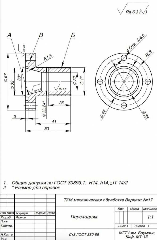 Для студентов МГТУ им. Н.Э.Баумана по предмету Технология конструкционных материалов (ТКМ)Механическая обработка заготовок деталей машин - ПереходникМеханическая обработка заготовок деталей машин - Переходник