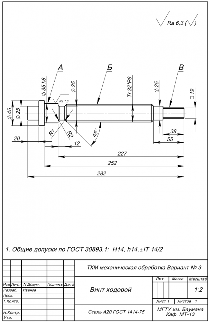 Для студентов МГТУ им. Н.Э.Баумана по предмету Технология конструкционных материалов (ТКМ)Механическая обработка деталей машин - Винт ходовойМеханическая обработка деталей машин - Винт ходовой