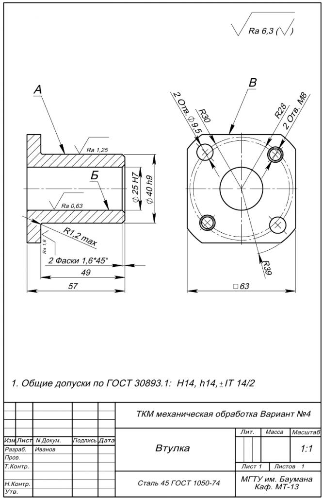Для студентов МГТУ им. Н.Э.Баумана по предмету Технология конструкционных материалов (ТКМ)Механическая обработка деталей машин - ВтулкаМеханическая обработка деталей машин - Втулка
