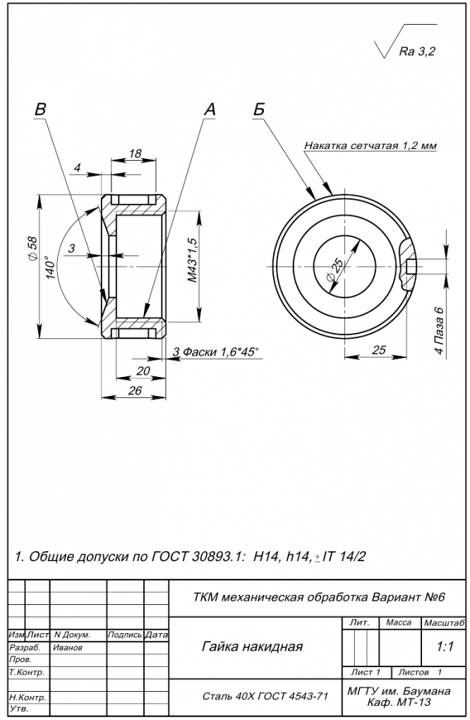 Для студентов МГТУ им. Н.Э.Баумана по предмету Технология конструкционных материалов (ТКМ)Механическая обработка деталей машин - Гайка накиднаяМеханическая обработка деталей машин - Гайка накидная