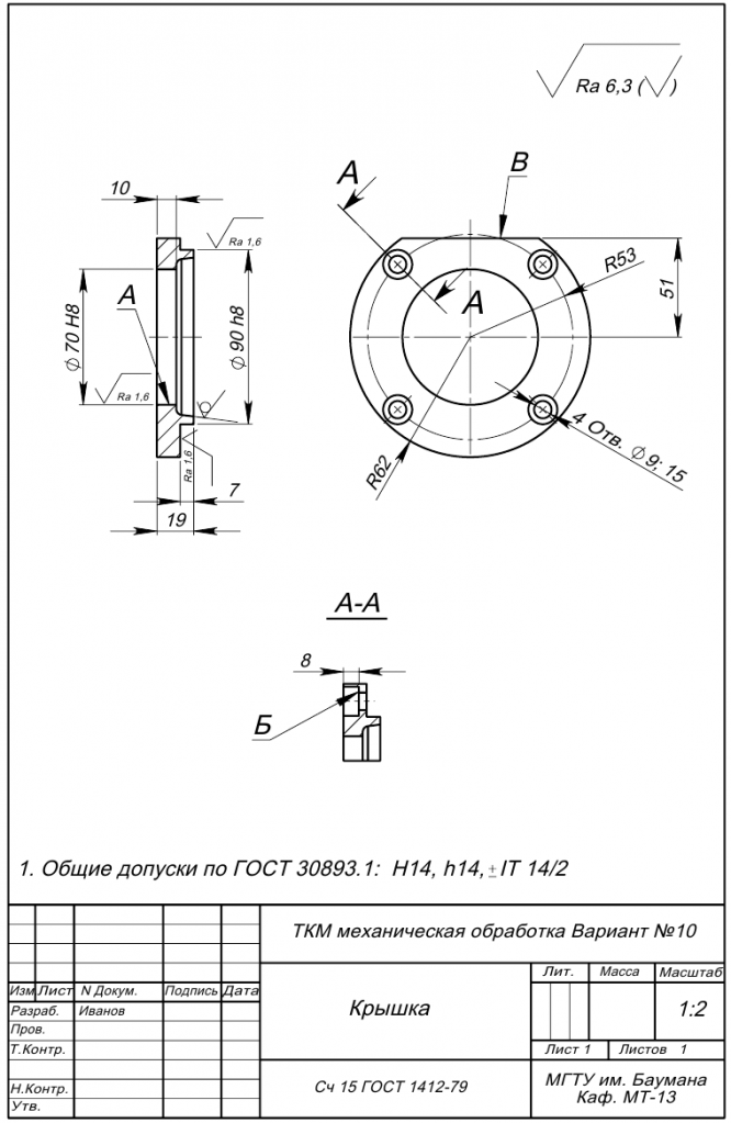 Для студентов МГТУ им. Н.Э.Баумана по предмету Технология конструкционных материалов (ТКМ)Механическая обработка деталей машин - КрышкаМеханическая обработка деталей машин - Крышка