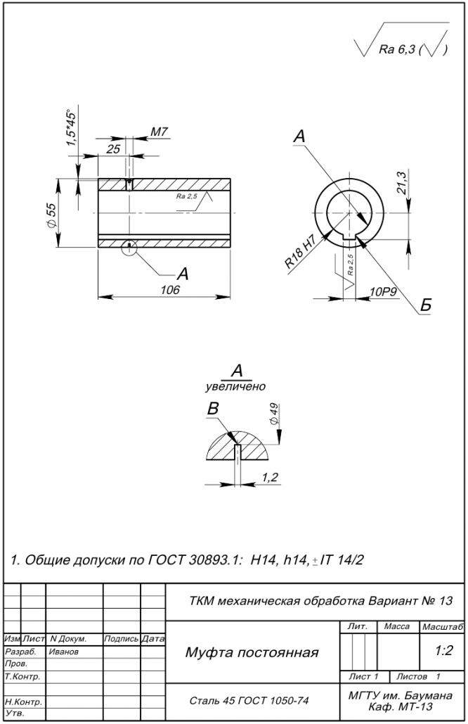 Для студентов МГТУ им. Н.Э.Баумана по предмету Технология конструкционных материалов (ТКМ)Механическая обработка деталей машин - Муфта постояннаяМеханическая обработка деталей машин - Муфта постоянная