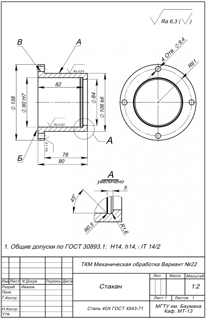 Для студентов МГТУ им. Н.Э.Баумана по предмету Технология конструкционных материалов (ТКМ)Механическая обработка деталей машин - СтаканМеханическая обработка деталей машин - Стакан