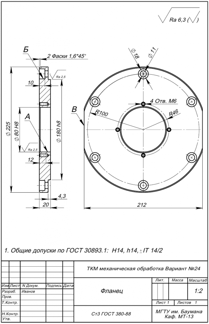 Для студентов МГТУ им. Н.Э.Баумана по предмету Технология конструкционных материалов (ТКМ)Механическая обработка деталей машин - ФланецМеханическая обработка деталей машин - Фланец