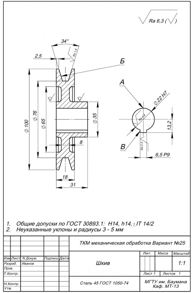 Для студентов МГТУ им. Н.Э.Баумана по предмету Технология конструкционных материалов (ТКМ)Механическая обработка деталей машин - ШкивМеханическая обработка деталей машин - Шкив
