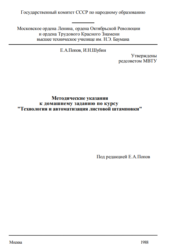 Для студентов МГТУ им. Н.Э.Баумана по предмету Технология листовой штамповки (ТЛШ) (МТ-6)Е.А. Попов - Методические указания к домашнему заданию по курсу "Технология и автоматизация листовой штамповки"Е.А. Попов - Методические указания к домашнему заданию по курсу "Технология и автоматизация листовой штамповки"