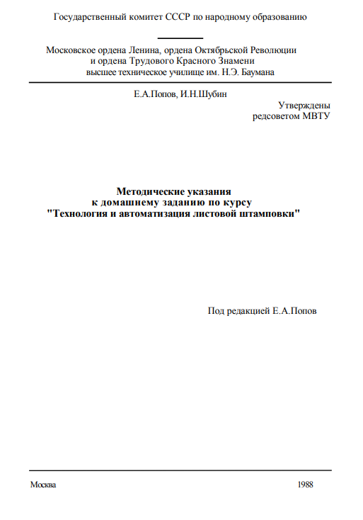 Для студентов МГТУ им. Н.Э.Баумана по предмету Технология листовой штамповки (ТЛШ) (МТ-6)Методические указания к домашнему заданию по курсу "Технология и автоматизация листовой штамповки"Методические указания к домашнему заданию по курсу "Технология и автоматизация листовой штамповки"
