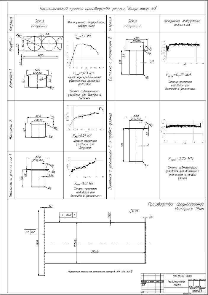 Для исследования и разработки технологического процесса был получен чертеж кожуха масляного фильтра, производимого мелкими партиями или единично, используя сварочное производство. Задача курсового проекта состояла в разработке процесса производства данного фильтра, но с учетом серийной потребности. Одним из наиболее перспективных решений, в данных условиях, являются технологии листовой штамповки. Они позволяют кроме получения лучших свойств металла и заданных размеров, избежать проблемы коррозии сварных швов. Для этого была составлена технологическая карта, включающая пять переходов вытяжки (в том числе три – с утонением), вырубку детали из полосы и окончательную правку. Разработаны чертежи штампов для двух переходов, а также деталировка рабочих инструментов. Произведение исследование, заключающееся в сравнение результатов моделирования (силы деформирования) в программном комплексе QForm, аналитически, и по расчетным формулам.