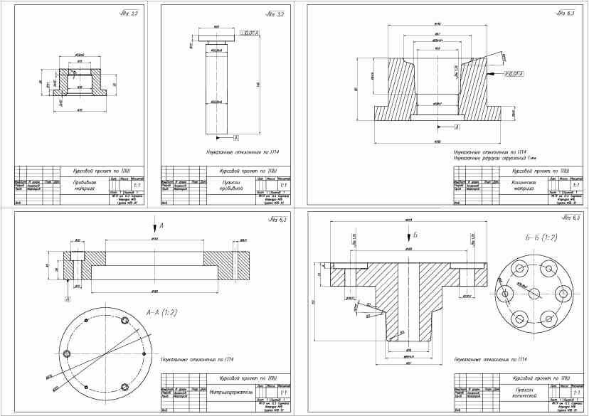 1. Технологическая карта 2. Штамп для вырубки-вытяжки 3. Штамп для вытяжки-пробивки 4. Деталировка (Пробивная матрица; Пуансон пробивной; Коническая матрица; Матрицедержатель; Пуансон конический)