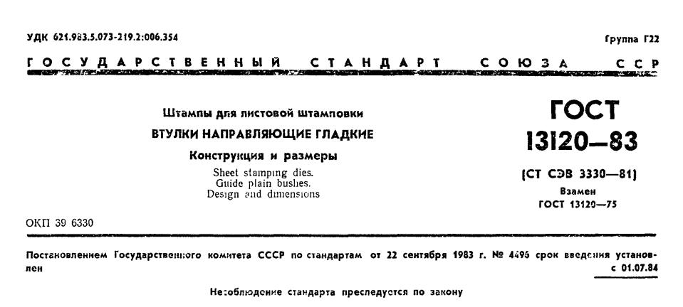 Для студентов МГТУ им. Н.Э.Баумана по предмету Технология листовой штамповки (ТЛШ) (МТ-6)ГОСТ 13120-83 - Штампы для листовой штамповки Втулки направляющие гладкиеГОСТ 13120-83 - Штампы для листовой штамповки Втулки направляющие гладкие 2021-01-18СтудИзба