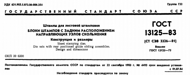 Стандарт: ГОСТ 13125-83 - Штампы для листовой штамповки Блоки штампов с задним расположением направляющих узлов скольжения