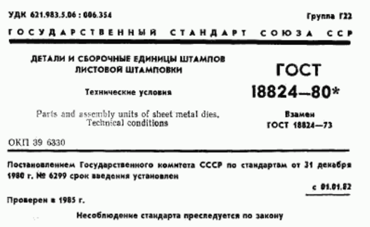 Для студентов МГТУ им. Н.Э.Баумана по предмету Технология листовой штамповки (ТЛШ) (МТ-6)ГОСТ 18824-80 - Детали и сборочные единицы штампов листовой штамповкиГОСТ 18824-80 - Детали и сборочные единицы штампов листовой штамповки