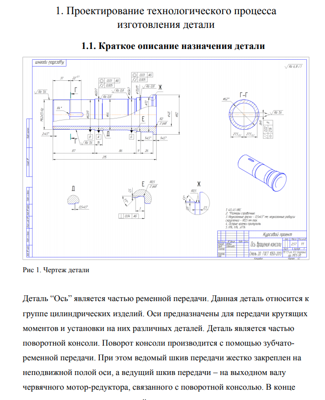 Деталь “Ось” является частью ременной передачи. Данная деталь относится к группе цилиндрических изделий. Оси предназначены для передачи крутящих моментов и установки на них различных деталей. Деталь является частью поворотной консоли. Поворот консоли производится с помощью зубчатоременной передачи. При этом ведомый шкив передачи жестко закреплен на неподвижной полой оси, а ведущий шкив передачи – на выходном валу червячного мотор-редуктора, связанного с поворотной консолью. В конце детали располагается шпоночный паз для передачи крутящего момента на ведомый шкив зубчато-ременной передачи.