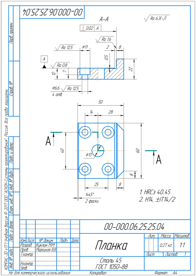 ДЗ: Разработка маршрутного технологического процесса изготовления детали - Планка