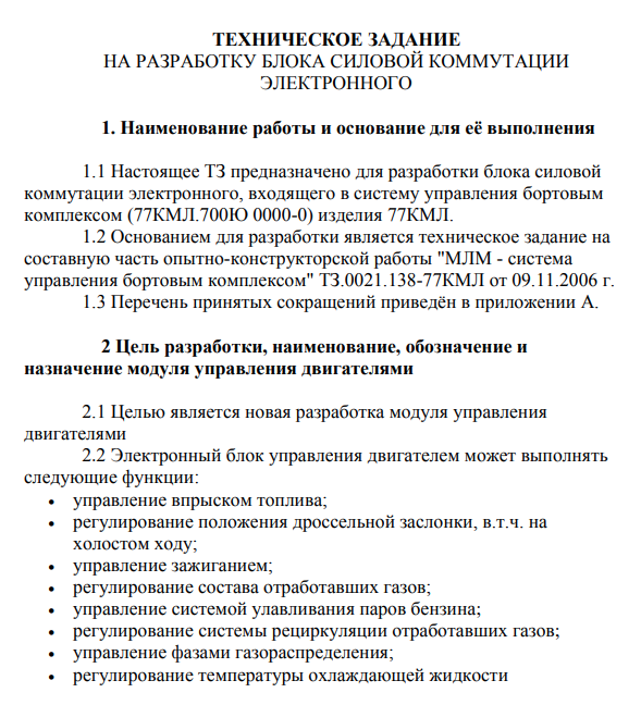 1. Наименование работы и основание для её выполнения 1.1 Настоящее ТЗ предназначено для разработки блока силовой коммутации электронного, входящего в систему управления бортовым комплексом (77КМЛ.700Ю 0000-0) изделия 77КМЛ. 1.2 Основанием для разработки является техническое задание на составную часть опытно-конструкторской работы "МЛМ - система управления бортовым комплексом" ТЗ.0021.138-77КМЛ от 09.11.2006 г. 1.3 Перечень принятых сокращений приведён в приложении А