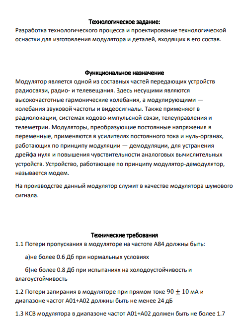 Технологическое задание: Разработка технологического процесса и проектирование технологической оснастки для изготовления модулятора и деталей, входящих в его состав.