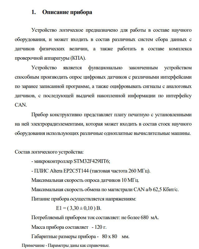 Устройство логическое предназначено для работы в составе научного оборудования, и может входить в состав различных систем сбора данных с датчиков физических величин, а также работать в составе комплекса проверочной аппаратуры (КПА). Устройство является функционально законченным устройством способным производить опрос цифровых датчиков с различными интерфейсами по заранее записанной программе, а также оцифровывать сигналы с аналоговых датчиков, с последующей выдачей накопленной информации по интерфейсу CAN. Прибор конструктивно представляет плату печатную с установленными на ней электрорадиэлементами, которая может входить в состав стоек научного оборудования использующих различные одноплатные вычислительные машины. Состав логического устройства: - микроконтроллер STМ32F429IIT6;
