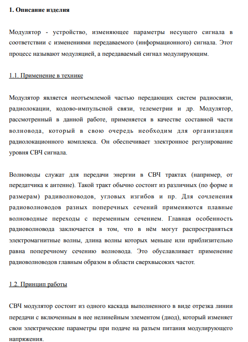 Описание изделия Модулятор - устройство, изменяющее параметры несущего сигнала в соответствии с изменениями передаваемого (информационного) сигнала. Этот процесс называют модуляцией, а передаваемый сигнал модулирующим. 1.1. Применение в технике Модулятор является неотъемлемой частью передающих систем радиосвязи, радиолокации, кодово-импульсной связи, телеметрии и др. Модулятор, рассмотренный в данной работе, применяется в качестве составной части волновода, который в свою очередь необходим для организации радиолокационного комплекса. Он обеспечивает электронное регулирование уровня СВЧ сигнала. Волноводы служат для передачи энергии в СВЧ трактах (например, от передатчика к антенне). Такой тракт обычно состоит из различных (по форме и размерам) радиволноводов, угловых изгибов и пр. Для сочленения радиоволноводов разных поперечных сечений применяются плавные волноводные переходы с переменным сечением. Главная особенность радиоволновода заключается в том, что в нём могут распространяться электромагнитные волны, длина волны которых меньше или приблизительно равна поперечному сечению волновода. Это обуславливает применение радиоволноводов главным образом в области сверхвысоких частот