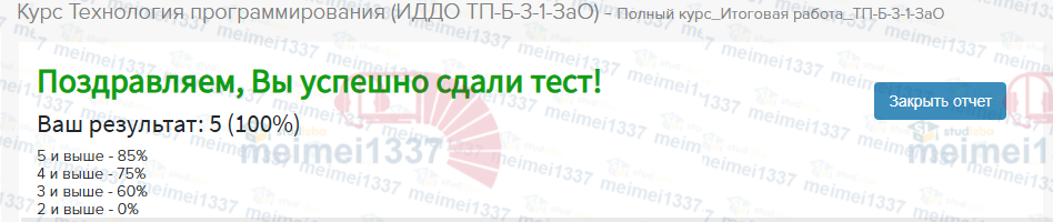 Главная » Учебные материалы » Технология программирования » Ответы » ИДДО НИУ «МЭИ» » Несколько классов/семестров » Номер Экзамен » К экзамену » Курс Технология программирования - Полный/Аттестационный курс Итоговая работа