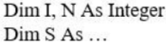 На языке VBA объявить две целочисленных переменных I и N, и одну строковую переменную S можно так: