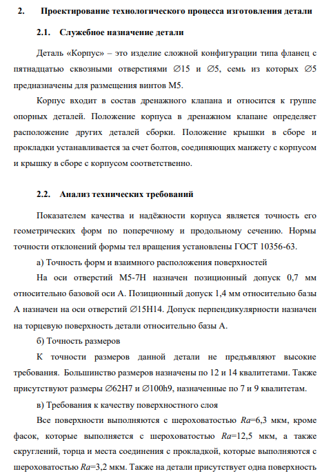 Деталь «Корпус» – это изделие сложной конфигурации типа фланец с пятнадцатью сквозными отверстиями 15 и 5, семь из которых 5 предназначены для размещения винтов М5. Корпус входит в состав дренажного клапана и относится к группе опорных деталей. Положение корпуса в дренажном клапане определяет расположение других деталей сборки. Положение крышки в сборе и прокладки устанавливается за счет болтов, соединяющих манжету с корпусом и крышку в сборе с корпусом соответственно.